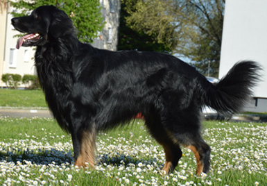Lava ist eine großrahmige, mittelkräftige Hündin mit einem schönen Kopf, gut mittelbraune Augen, korrekte Ohren, kompletten Scherengebiss und korrekten Gebäudeproportionen. Sie hat ein tiefschwarzes Haarkleid von mittlerer Länge und mittelblonden Marken, die am Kopf, Brust nur angedeutet sind. Ihre Rute ist korrekt und wird etwas seitwärts getragen.